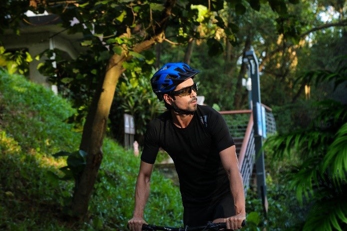 今回コラボした商品は「WICUEスライド式調光サングラス・スポーツタイプ」。この商品はテンプルサイドのタッチセンサーをスワイプすることで、レンズ濃度が変わるという構造。5段階でレンズ濃度を調整することができます。アクティブなシーンでスマートに太陽光や光による眩しさから解放してくれる優れものです。