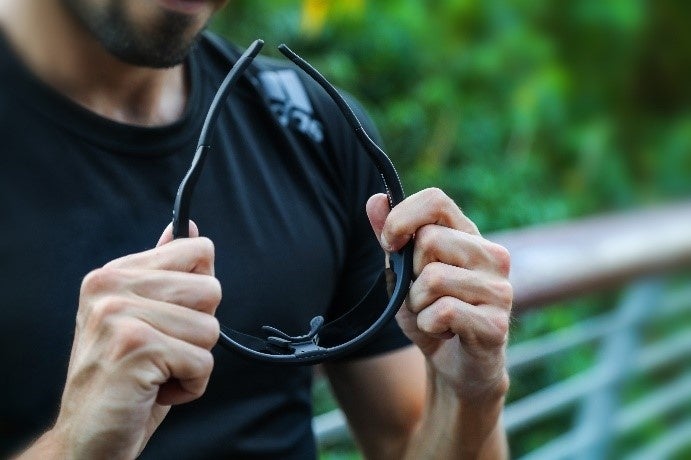 今回コラボした商品は「WICUEスライド式調光サングラス・スポーツタイプ」。この商品はテンプルサイドのタッチセンサーをスワイプすることで、レンズ濃度が変わるという構造。5段階でレンズ濃度を調整することができます。アクティブなシーンでスマートに太陽光や光による眩しさから解放してくれる優れものです。