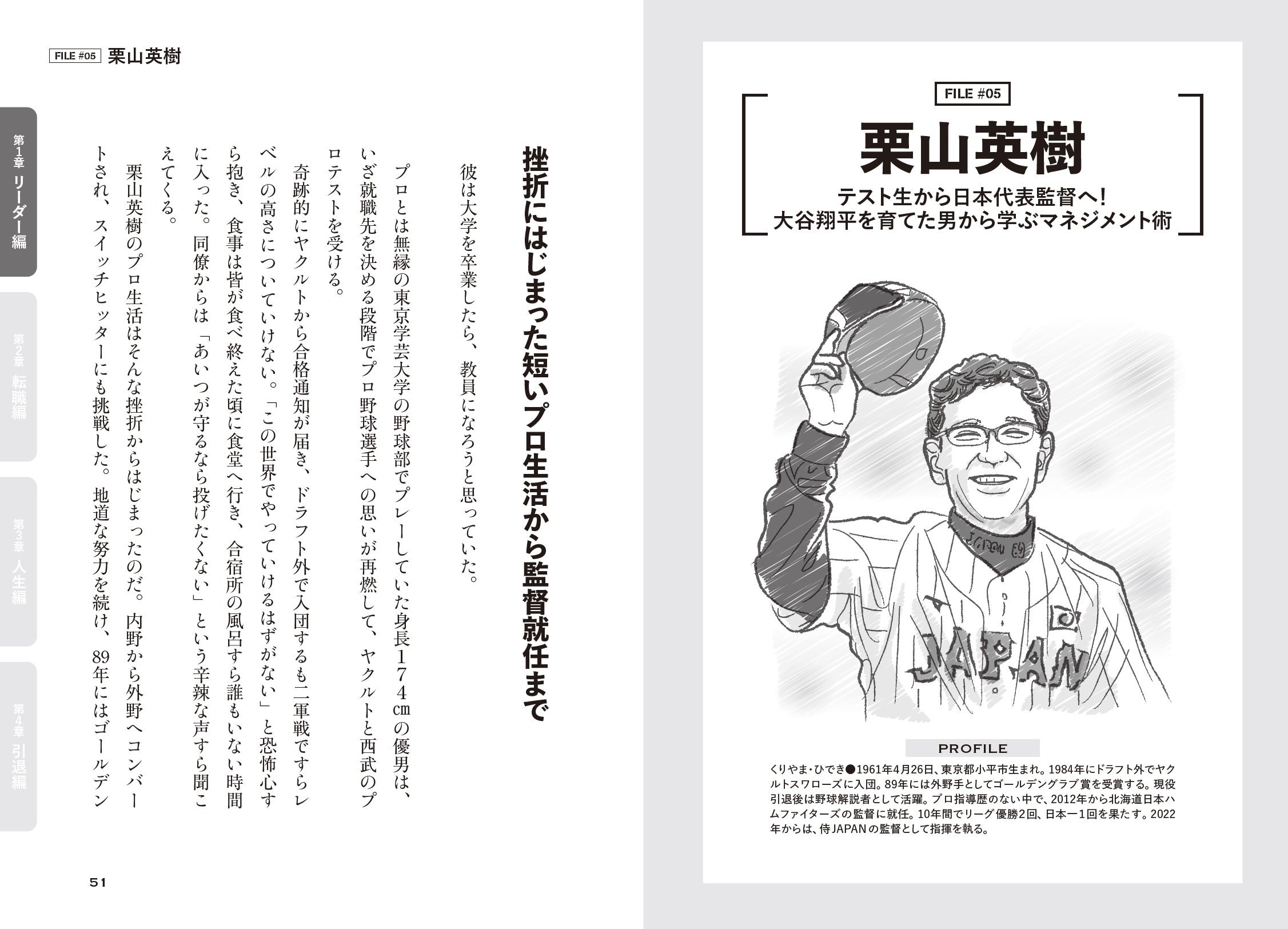 大谷翔平、栗山英樹、坂本勇人、新庄剛志、高津臣吾、吉井理人、鳥谷 敬、落合博満……など、現役の選手や監督から、かつての名選手まで、24人の野球人の熱い生きざまが本書には詰まっています。