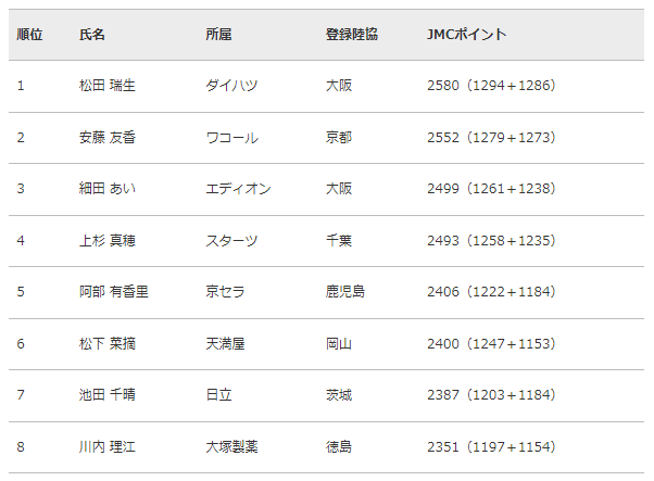 - <JMCシリーズⅡポイントランキング トップ8(女子)>