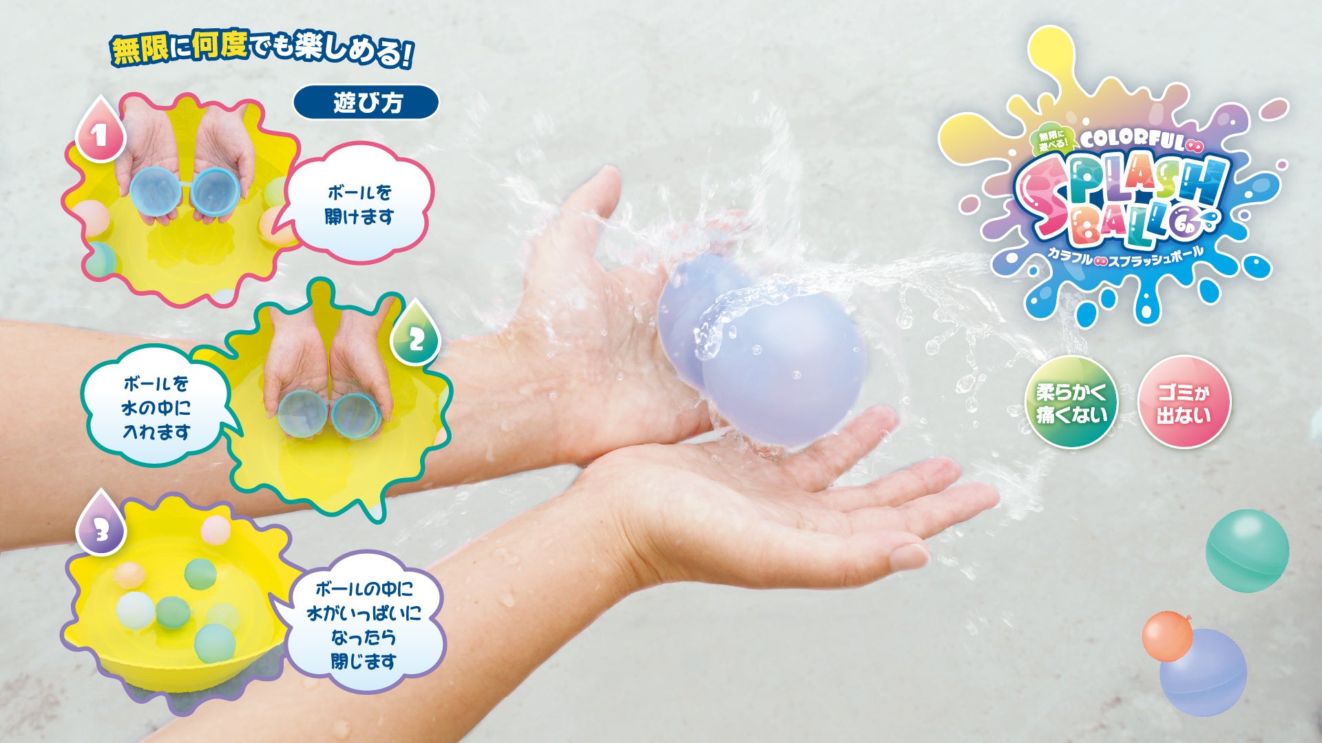 特徴:ボールを開けて水を入れるだけ。シリコン素材で何度でも無限に遊べる、スプラッシュボール!