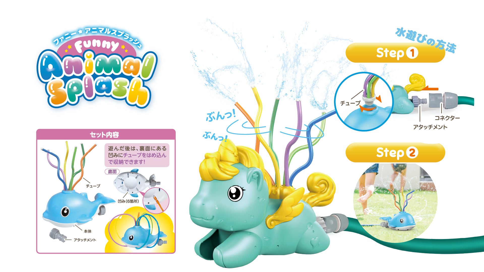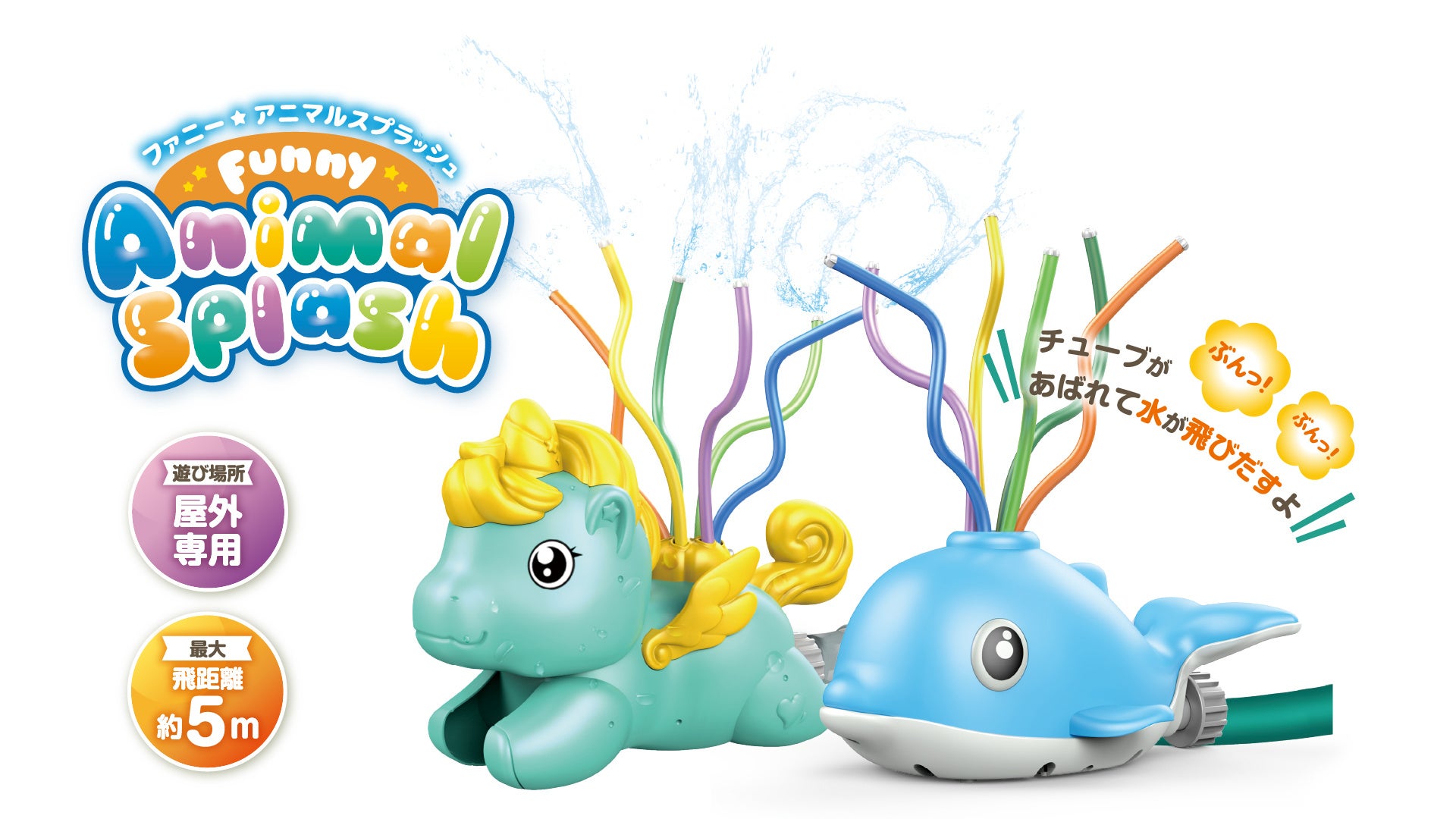 特徴:水道のホースにセットするだけで、楽しく水遊びができる♪水を噴射しながらチューブがぶんっ!ぶんっ!あらゆる方向に激しく水しぶきを撒き散らす♪最大飛距離が約5mで大人数で水遊びが可能。暑い夏もスプラッシュ・アニマルと水浴びをして楽しもう!