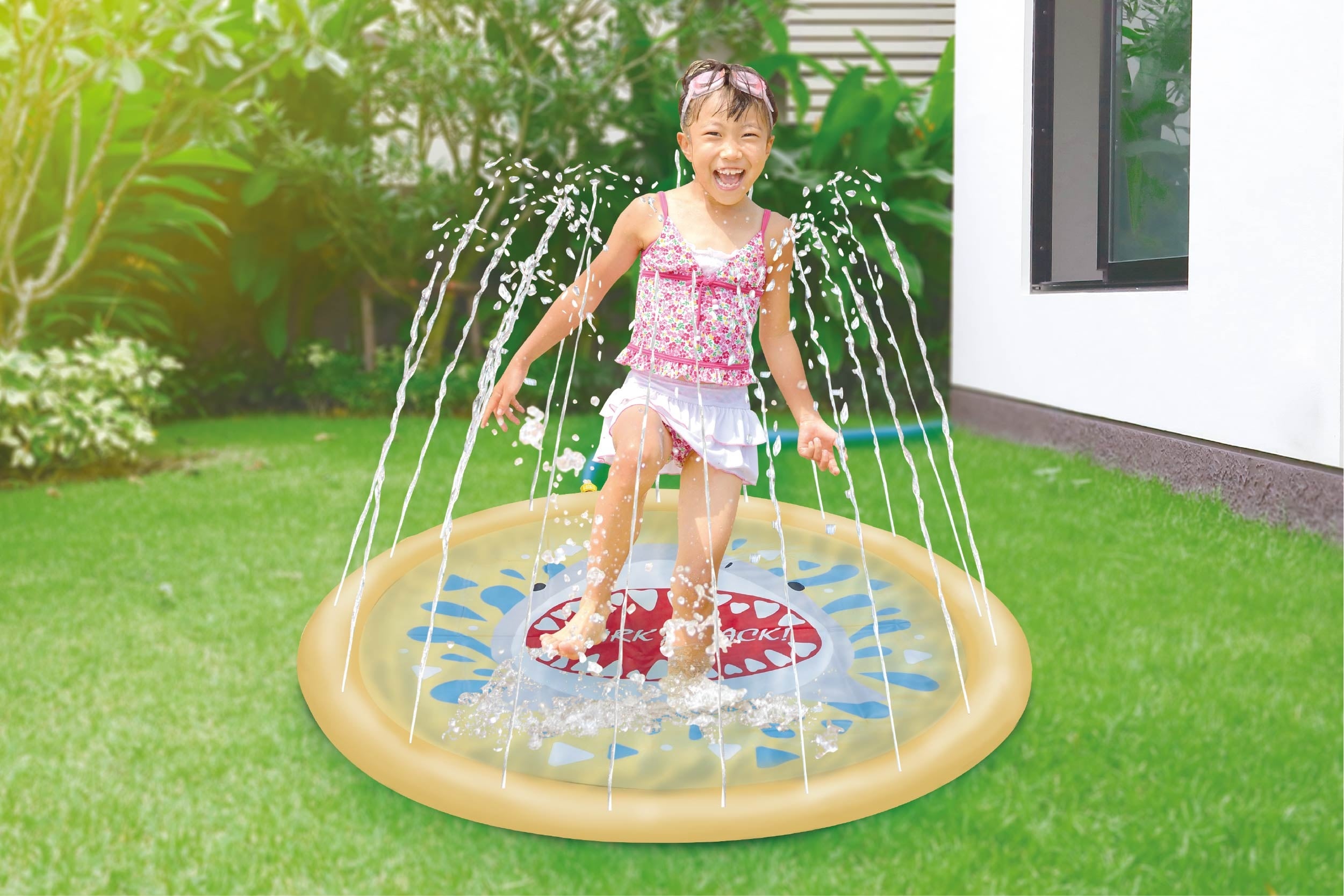 特徴:お水が飛び出す、ウォータープレイマット!360°シャワーが出るよ!空気入れ不要で、ホースに繋げるだけで手軽に遊べる♪蛇口の水量で水柱の高さが変わるよ!庭先や玄関、ガレージ置いて暑い夏を遊びつくそう!