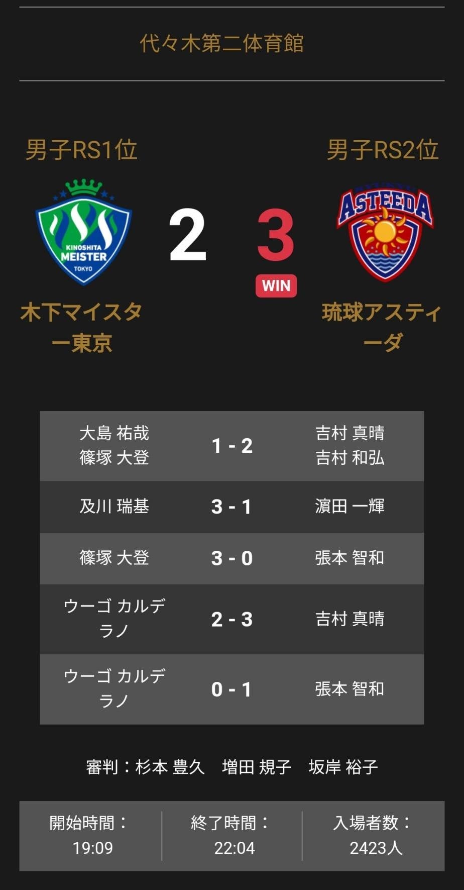 木下マイスター東京と琉球アスティーダの試合は3-2で琉球アスティーダが勝利しました。