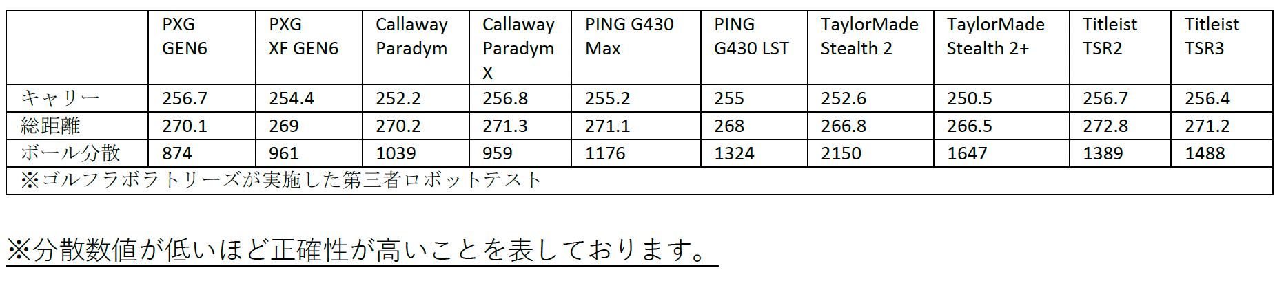 ゴルフラボラトリーズが実施した第三者ロボットテストによると、PXG GEN6ドライバーは、上位4社の最新プレミアムドライバーと比較して、クラス最高の分散性とともに、優れた飛距離性能を発揮します。