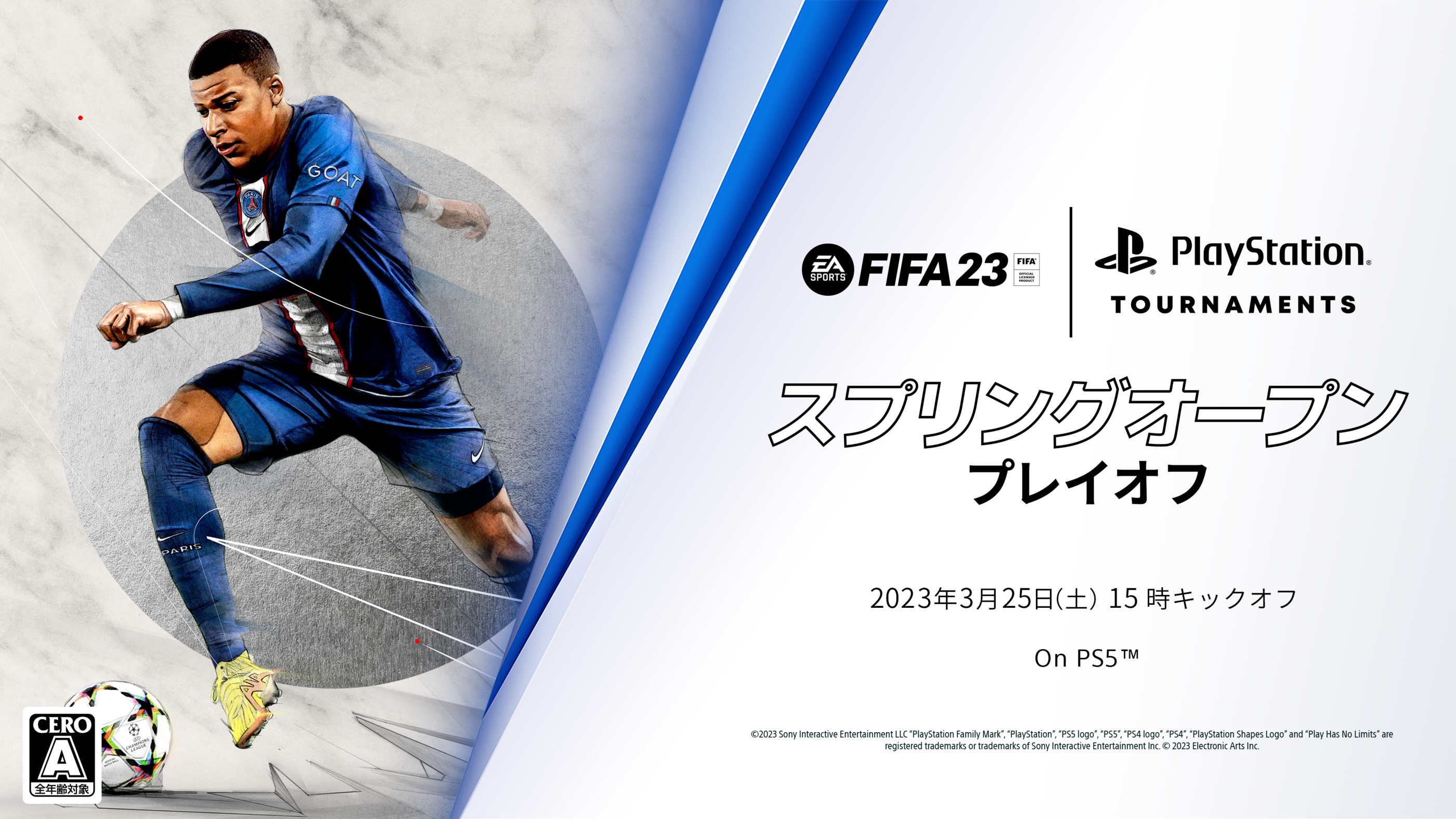 ソニー・インタラクティブエンタテインメント(SIE)は、PlayStation®5(PS5™)用ソフトウェア『EA SPORTS™ FIFA 23』(以下『FIFA 23』。発売元:エレクトロニック・アーツ)を起用し、「PS5トーナメント機能」を活用した新たなeスポーツ大会「FIFA 23 スプリングオープン」のプレイオフを、2023年3月25日(土)15時(日本時間)よりオンライン上で開催いたします。プレイオフでは、予選を勝ち抜いた選手たちが初代王座を目指して戦います。同日15時から19時(日本時間)にかけては、PlayStation公式YouTubeチャンネルや大会公式アンバサダーの公式チャンネルにて、プレイオフの模様をライブ配信するウォッチパーティーも行います。
