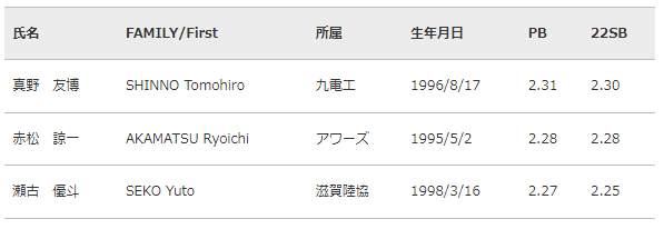 2023年5月21日(日)に日産スタジアムにて開催する「セイコーゴールデングランプリ陸上2023横浜」の、男子走高跳・走幅跳、女子走幅跳に出場を予定している選手を下記の通りお知らせいたします。(2023年3月24日現在。)
