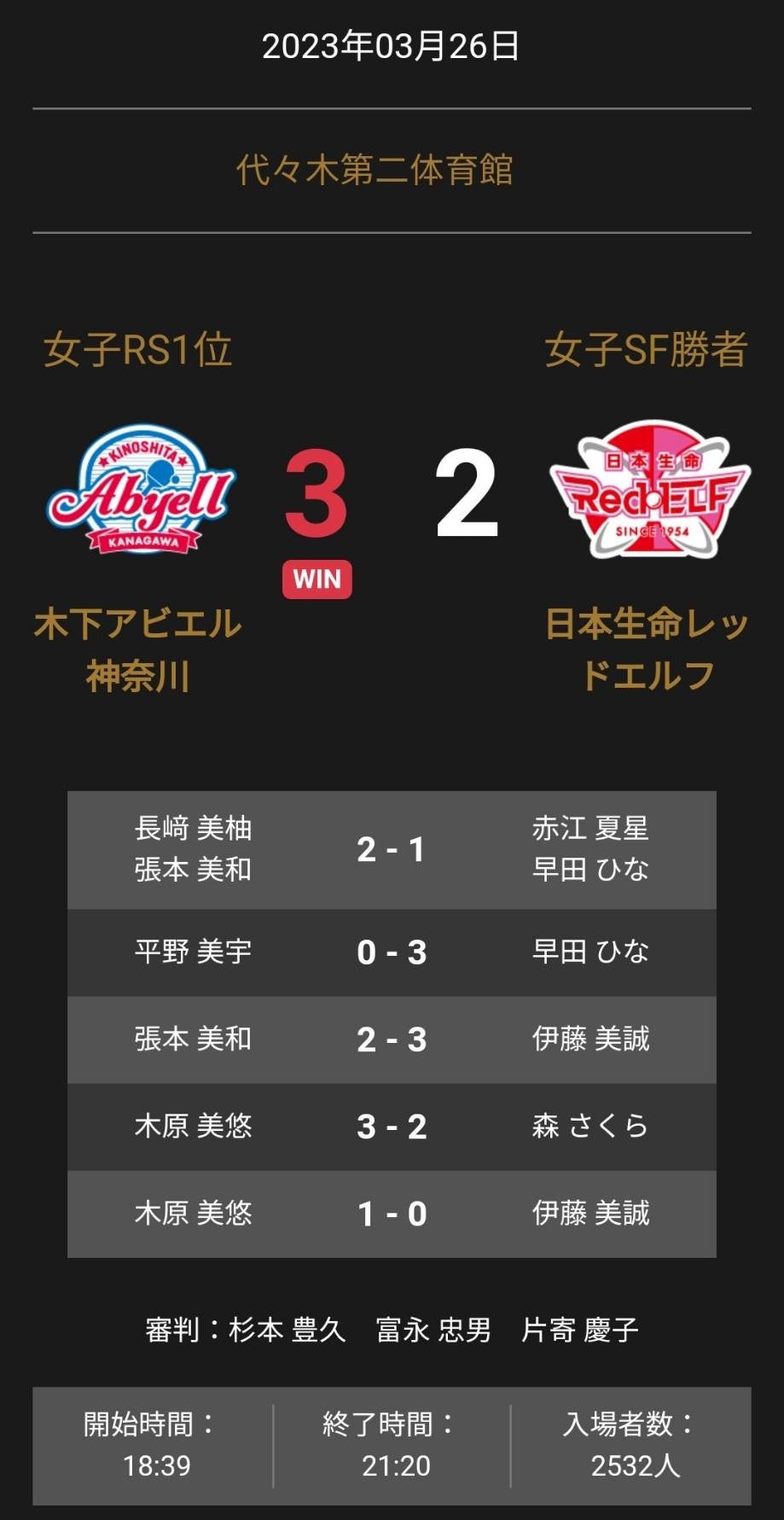 木下アビエル神奈川と日本生命レッドエルフの試合は3-2で木下アビエル神奈川が勝利しました。