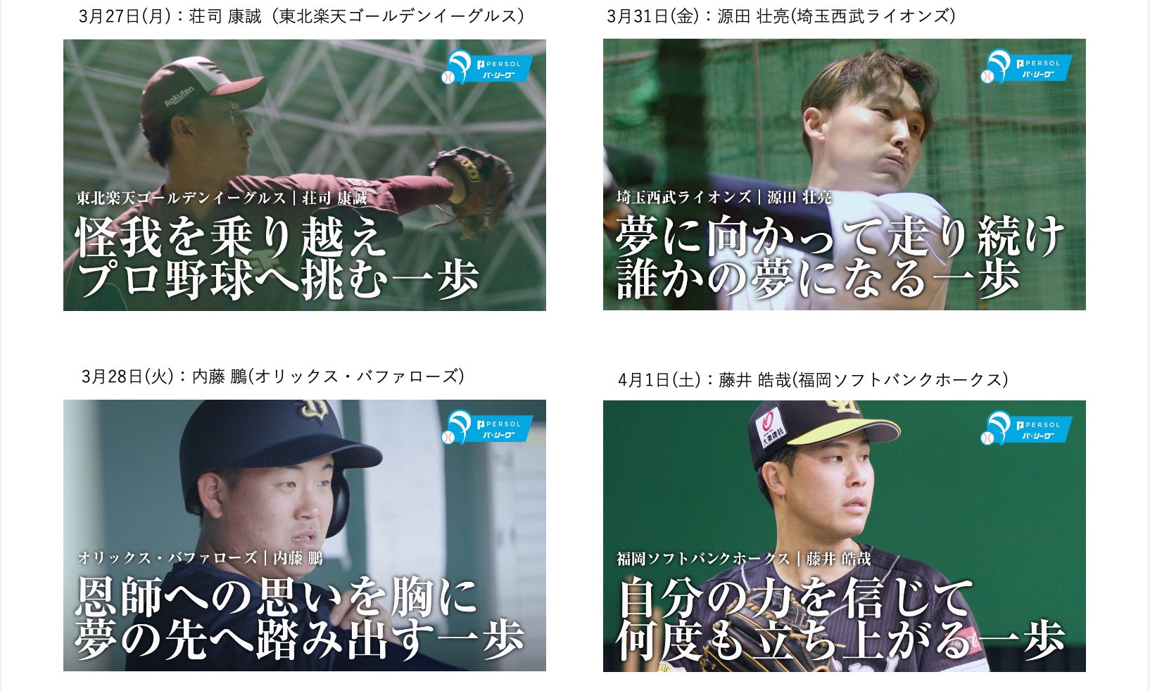 パシフィックリーグマーケティング株式会社(本社:東京都中央区、代表取締役CEO:根岸 友喜)と、2023年パシフィック・リーグ公式戦のタイトルパートナーの総合人材サービスのパーソルホールディングス株式会社 (本社:東京都港区、代表取締役社長CEO:和田 孝雄)は、パーソル パ・リーグ開幕を前に「どんな一歩にも価値がある」と題し、新人・現役・引退の計8名の一歩に迫ったドキュメンタリームービーを、3月27日(月)よりパ・リーグ応援特設ページ、パーソル公式YouTubeチャネル、およびパーソル パ・リーグTV公式YouTubeチャンネルにて順次公開することをご案内いたします。また、2023 パーソル パシフィック・リーグの6球団球場内ビジョン特別CMも3月30日(木)開幕戦より放映開始いたします。