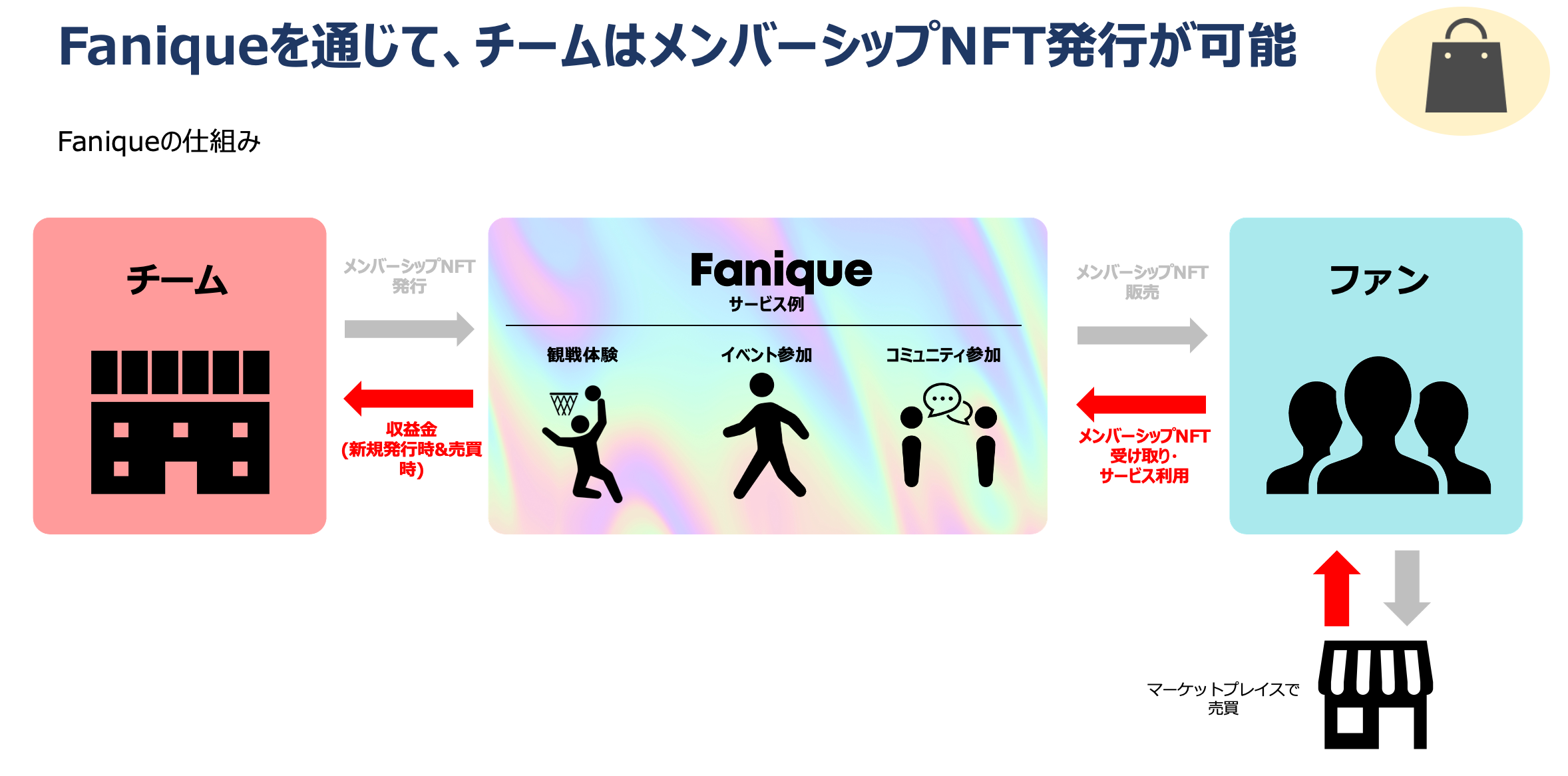 Faniqueは、NFTとファンクラブの機能を融合した、新しい形態のファンクラブサービスです。スポーツチームは、メンバーシップNFTを発行することができます。メンバーシップNFTを活用することで、従来のファンクラブの機能に加え、チームの重要な意思決定に関与することやチームや選手への応援量が価値となり所有することが可能になります。