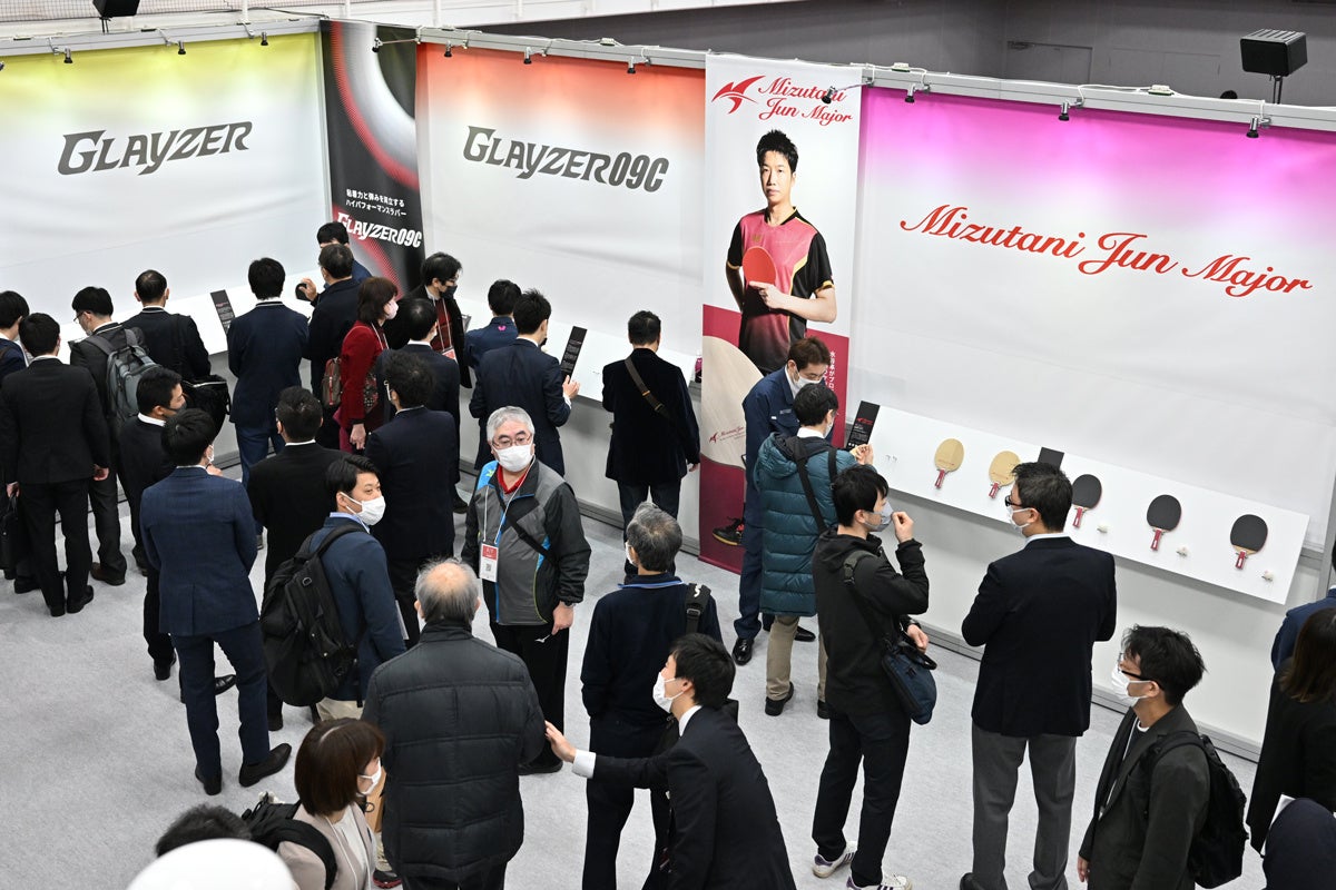 会場には、バタフライ・ゴールドメダル・アドバイザーの水谷隼氏が入門者用ラケットとしてプロデュースした『水谷隼 メジャー』(4月1日発売予定)のほか、今春発売される新製品を展示しており、来場した全国の流通業者様に一足早く新製品に触れていただくことができました。