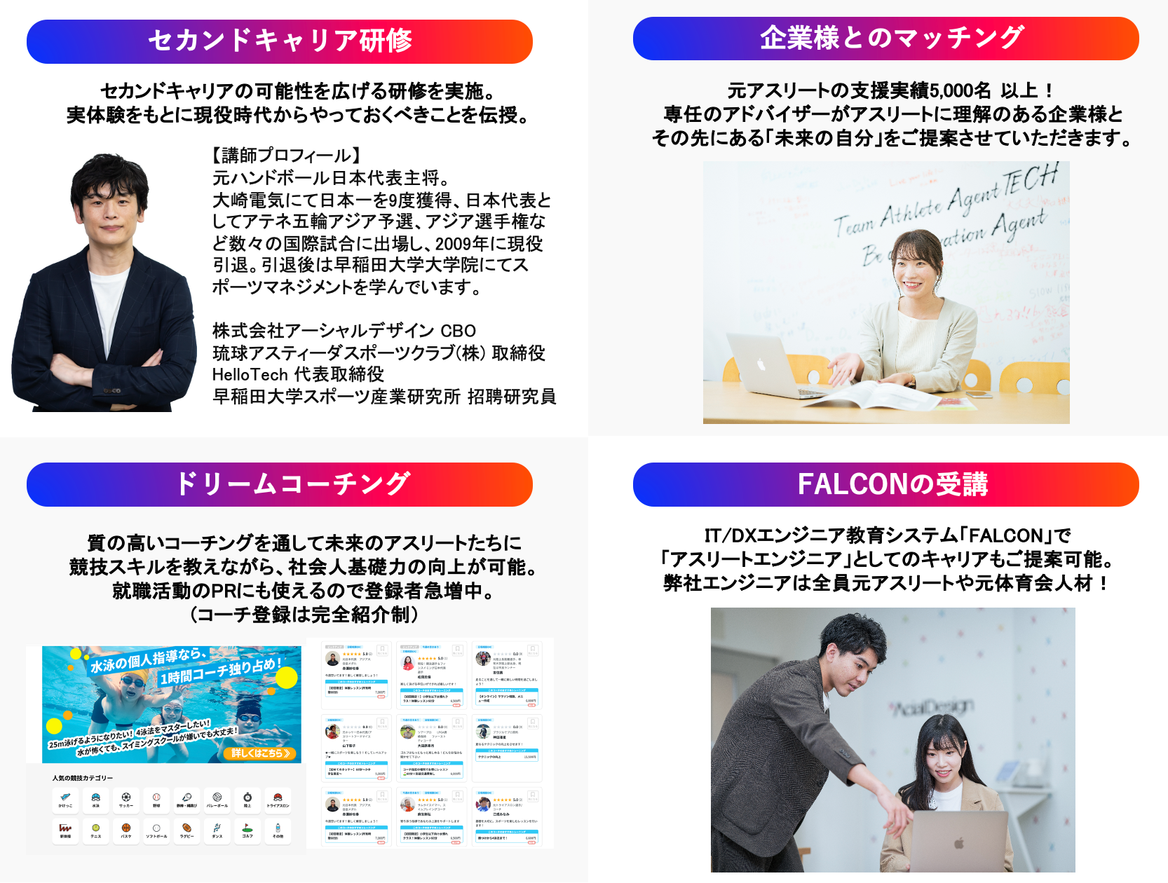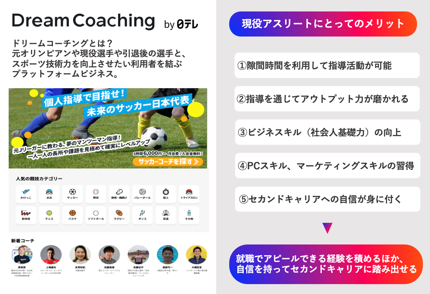プロの世界や五輪・世界大会で活躍したトップアスリートが多数参加している『ドリームコーチング』との協業を通して、引退後のセカンドキャリア支援だけでなく現役時代からのサポートが実現可能となります。
