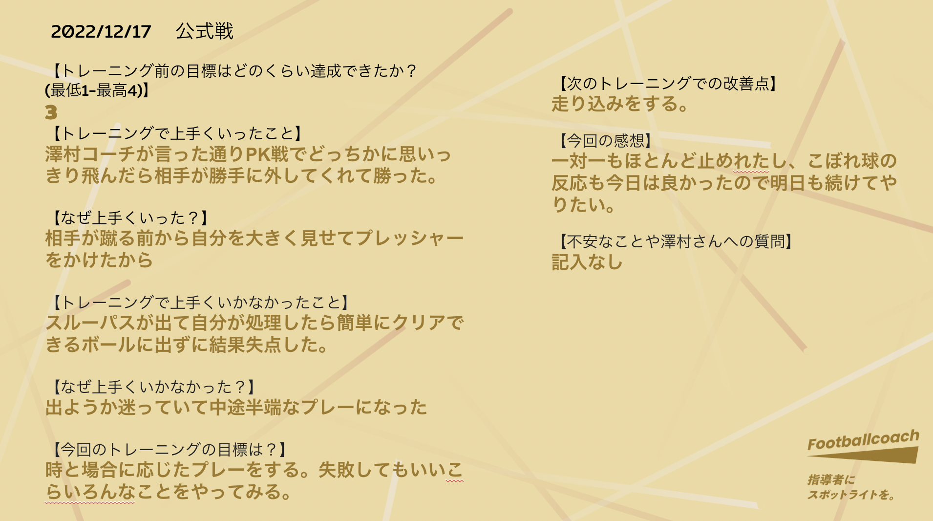 クラブチームや部活動でスポーツに取り組む小中学生が、課題に感じていること、苦手なこと、得意なことなどをオンライン上での毎日の交換日記を用いて指導者と共有し、翌日や次回活動に向けた目標設定を行います。オンライン上での選手と指導者 1on1のやり取りのため、指導者への質問や不安点などを周りの目を気にすることなく質問できる仕組みです。