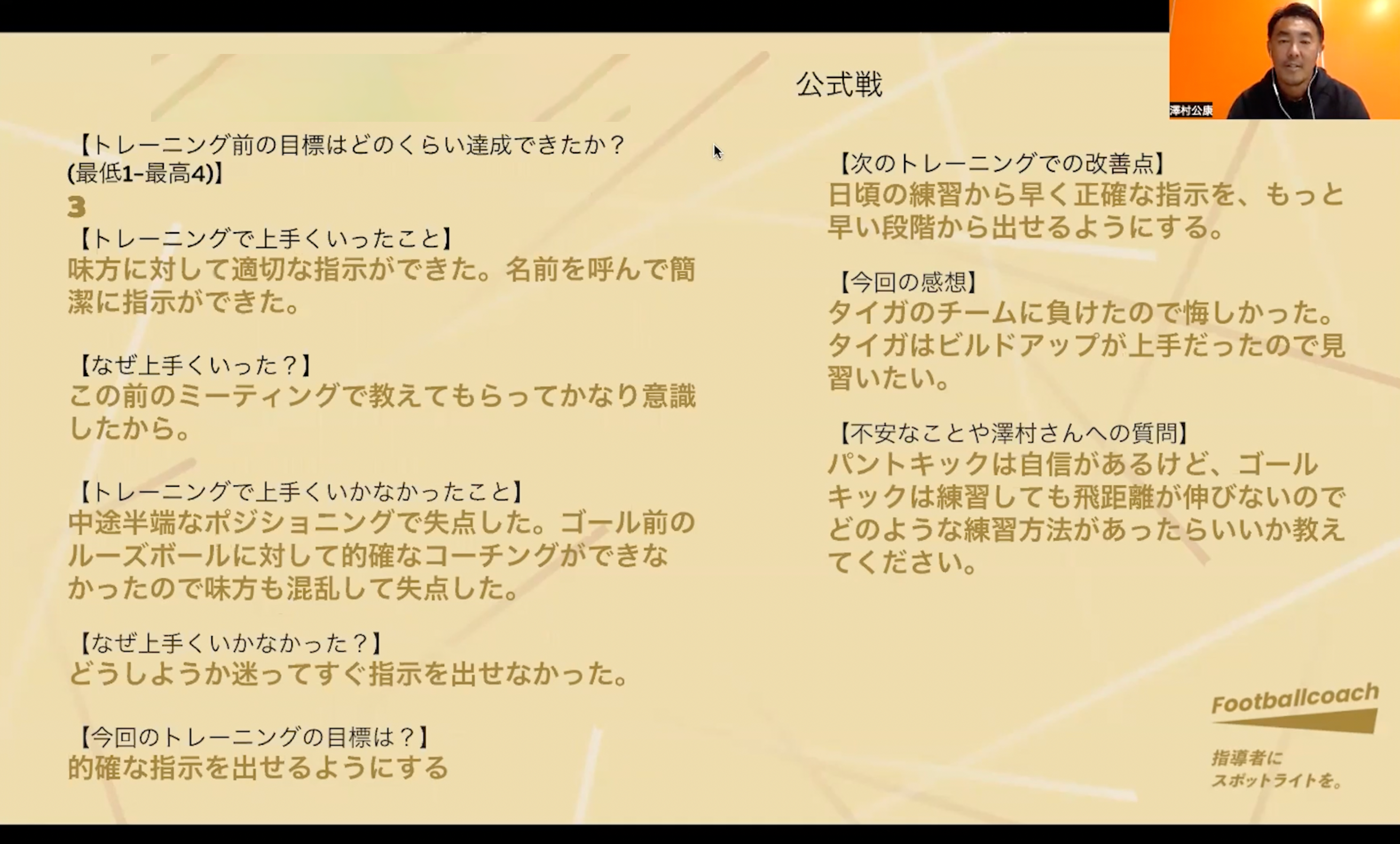 また週一回の全体ミーティングは、参加選手と指導者による『一週間の活動を振り返る時間』です。タイミングによっては、日本代表やJリーグでの試合を用いた指導者からのレクチャーなども行います。
