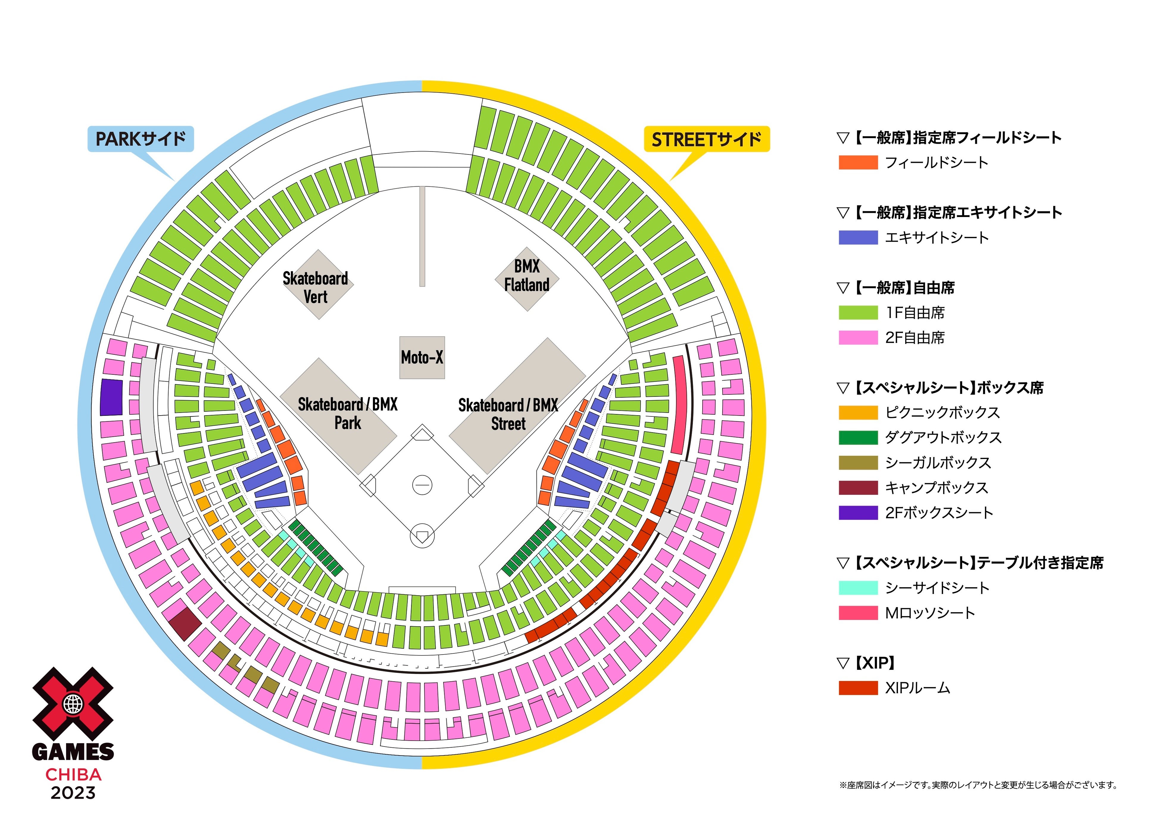 「X Games Chiba 2023」はスタジアムのグラウンド内にStreet(ストリート)、Park(パーク)、Vert(バート)、Flatland(フラットランド)、Moto-X(モトエックス)の5つの競技ステージを設置し、観客席はグラウンドを取り囲むように配置しています。