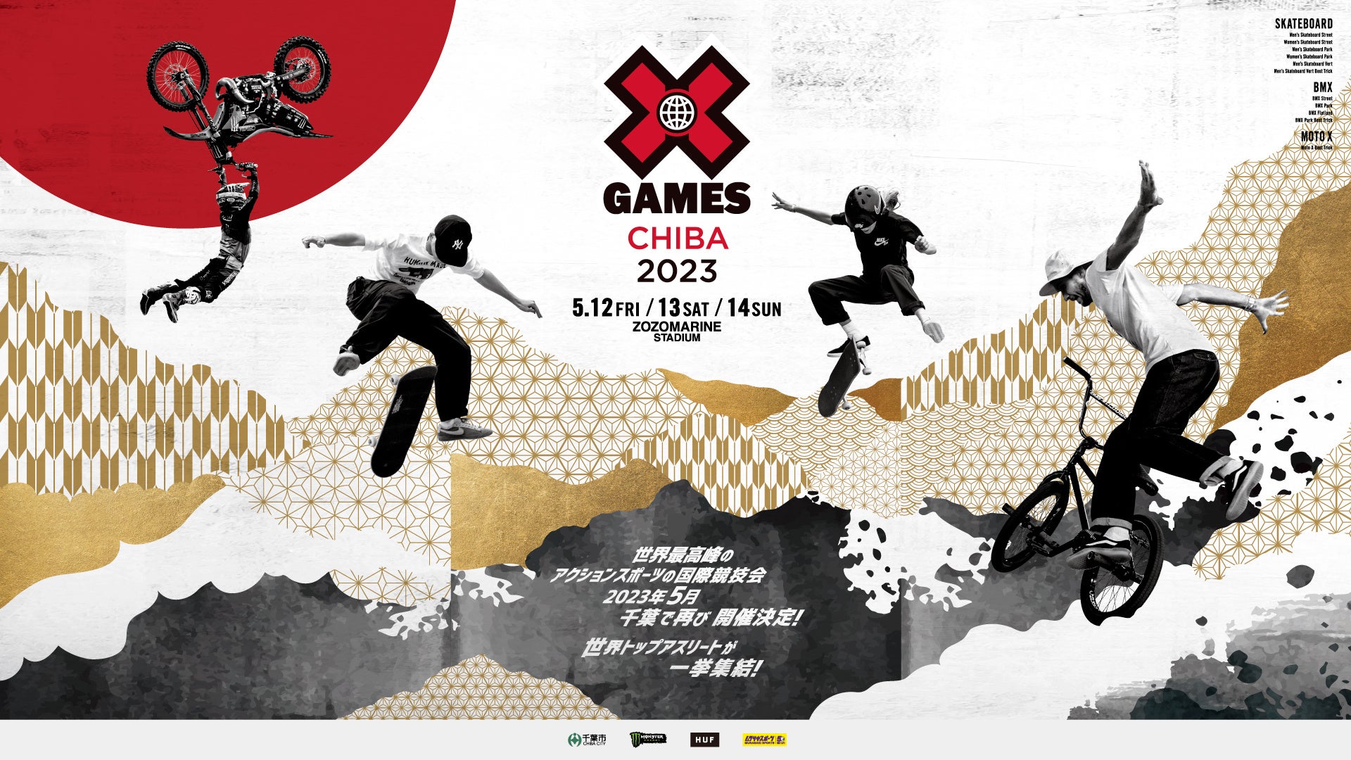 世界最高峰のアクションスポーツの国際競技会「X Games」(エックスゲームズ)が千葉で再び開催決定! 2023年5月12日(金)、13日(土)、14日(日)の3日間にわたってスケートボード、BMX、Moto Xの人気アクションスポーツ競技を「ZOZOマリンスタジアム」で繰り広げます。