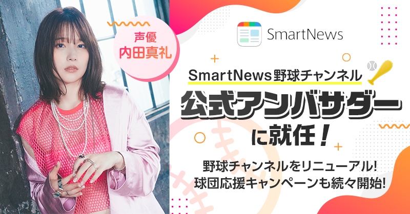 スマートニュース株式会社のニュースアプリ、SmartNewsの「野球チャンネル」で、熱心なプロ野球ファンとして知られる声優の内田真礼(うちだまあや)さんが、公式アンバサダーに就任しました。SmartNewsでは、プロ野球開幕に合わせ、6球団の応援キャンペーンを本日より順次実施します。内田さんは、各球団の応援キャンペーン開始時に、球団ごとに注目するポイント、「わたしの注目」をツイートし、キャンペーンを盛り上げます。