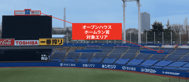 神宮球場バックスクリーン上部の看板(スローガンおよび社名ロゴ)、またはスタンドに設置されている特設エリアに、ホームランを直接当てたスワローズの選手へ「東京の家」をプレゼントいたします。