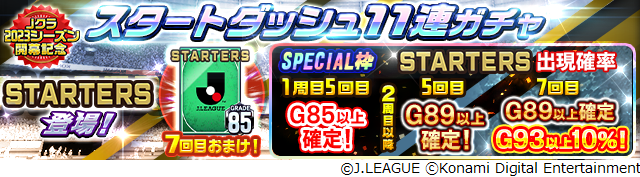 本キャンペーンでは、Jリーグ全40クラブから各クラブ4選手ずつ、計160名が「スターター」カードとして登場するほか、期間中毎日ログインするだけで「G85以上ガチャ券」などのアイテムが獲得できる「Jクラ2023シーズン開幕記念!スペシャルログインボーナス」や、G85以上の選手が確定で手に入る「Jクラ2023シーズン開幕記念!スタートダッシュ11連ガチャ」などのイベントを開催!