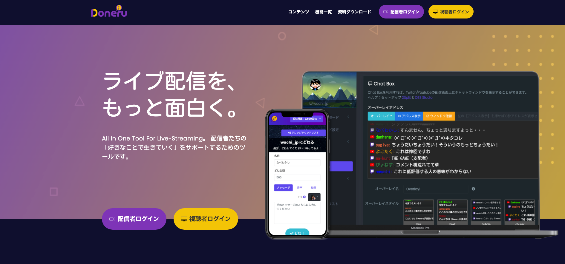 Doneruは配信者・クリエイターのためのライブ配信拡張プラットフォームです。