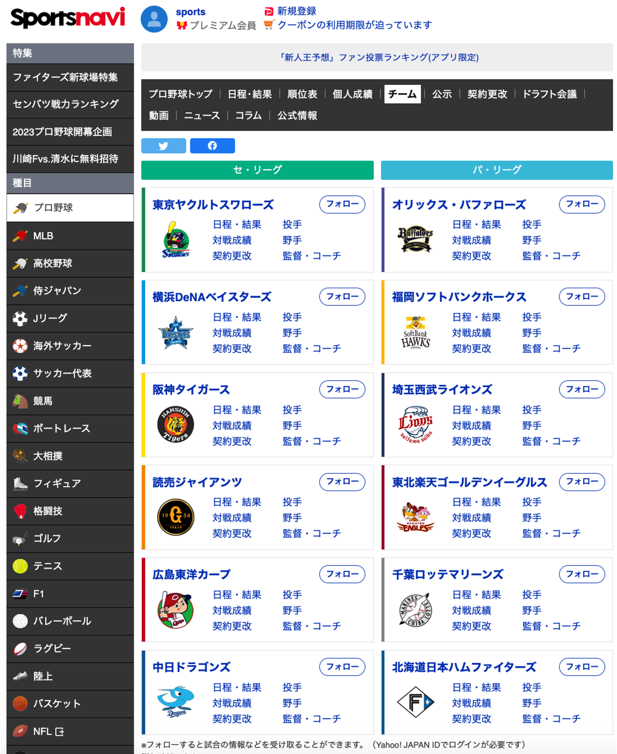2.「フォロー」したい球団が表示されている一覧ページ ( https://baseball.yahoo.co.jp/npb/teams/ )、もしくは球団のページを開く
