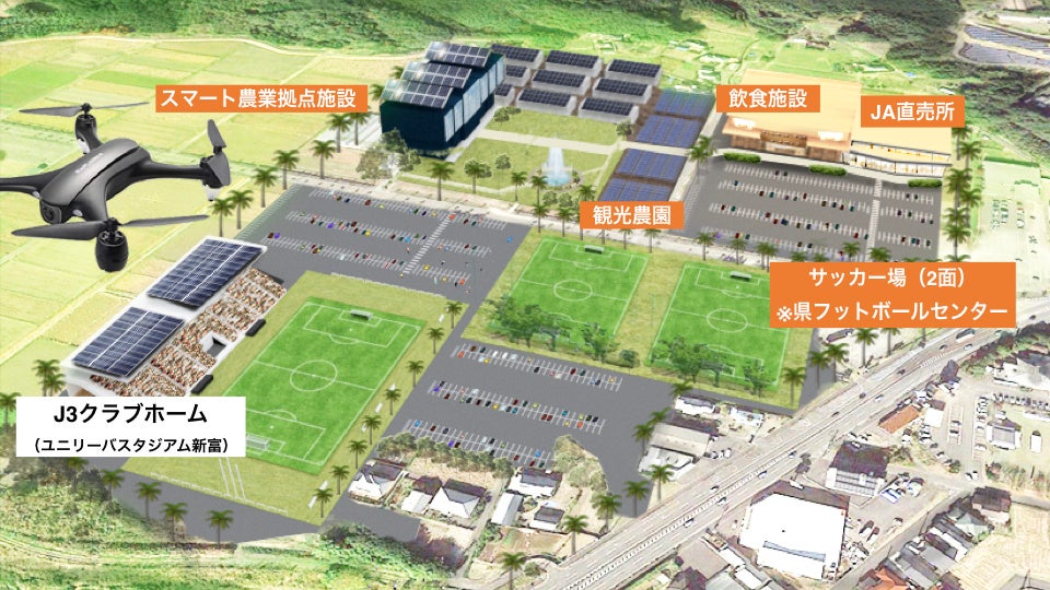 この2つの施設の北側には、企業の農業参入による試験的農業の実験施設である「新富町農業振興施設」のほか、農畜産物直売所がオープン予定。町の主幹産業である農業とサッカーによる集客で、関係人口・交流人口増大の相乗効果を期待しています。