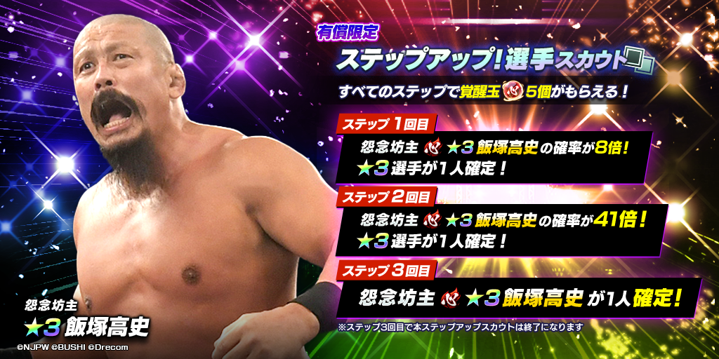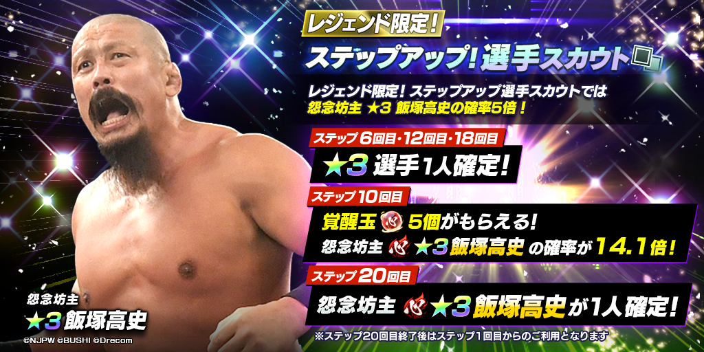 新日SSは2023年4月1日(土)0:00から、★3選手「[怨念坊主]飯塚 高史」が登場する「レジェンド限定!ステップアップ!選手スカウト」を開催しております。