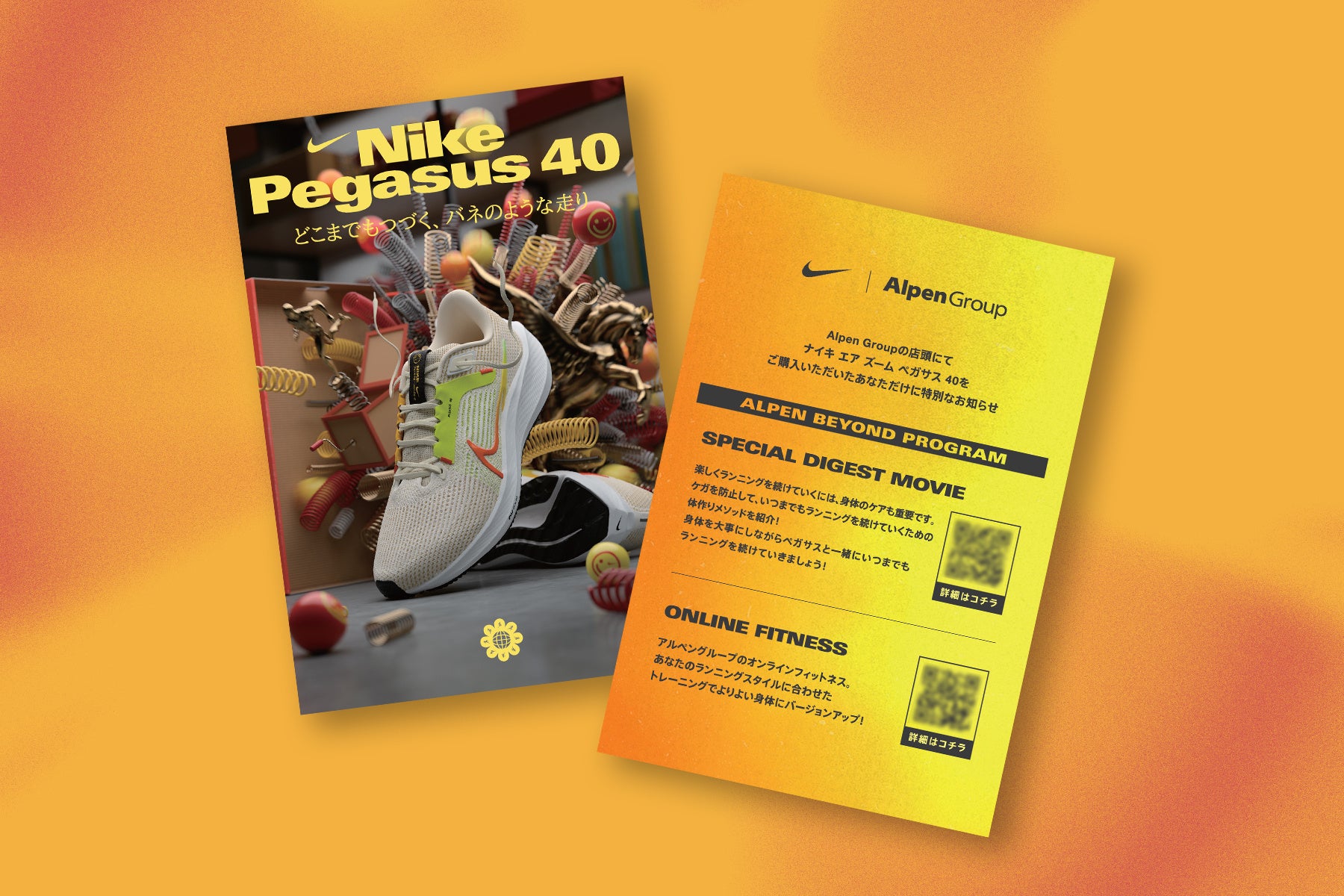 アルペングループが運営する本格オンラインフィットネス「Alpen BEYOND PROGRAM(アルペンビヨンドプログラム)」が、今回の先行販売にあわせて特別に用意した、限定ダイジェスト動画にアクセスできるカードをプレゼントいたします。40代にもわたりアップデートを続けてきたナイキ エア ズーム ペガサス。楽しくランニングを続けていくためには、ペガサス同様に身体のケアやアップデートも重要です。進化し続けるペガサスと共にいつまでも走り続けてほしいという思いから、限定ダイジェスト動画ではケガを防止しいつまでもランニングを続けていくための身体づくりメソッドをご紹介します。