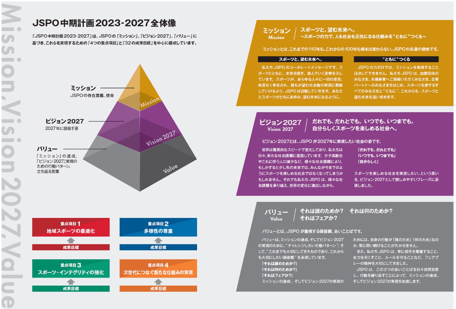 「JSPO中期計画2023-2027」では、JSPOの「ミッション」、「ビジョン」、「バリュー」