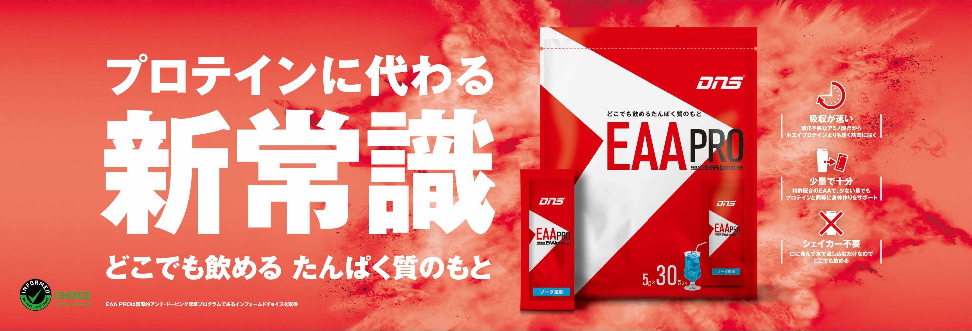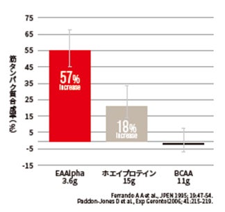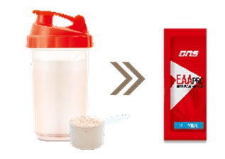 身体作りに必要な9種類の必須アミノ酸とアルギニンが特別な比率で混合された米国特許取得のアミノ酸で、2022年4月にDNS社が特許ライセンスを取得。一般的なEAAが15gで筋たんぱく質合成を55%促進させるのに対して、「EAAlpha(イーエーエーアルファ)」はアミノ酸たった3.6gで同等の効果を達成し、従来の1/4量で身体作りをサポートします。