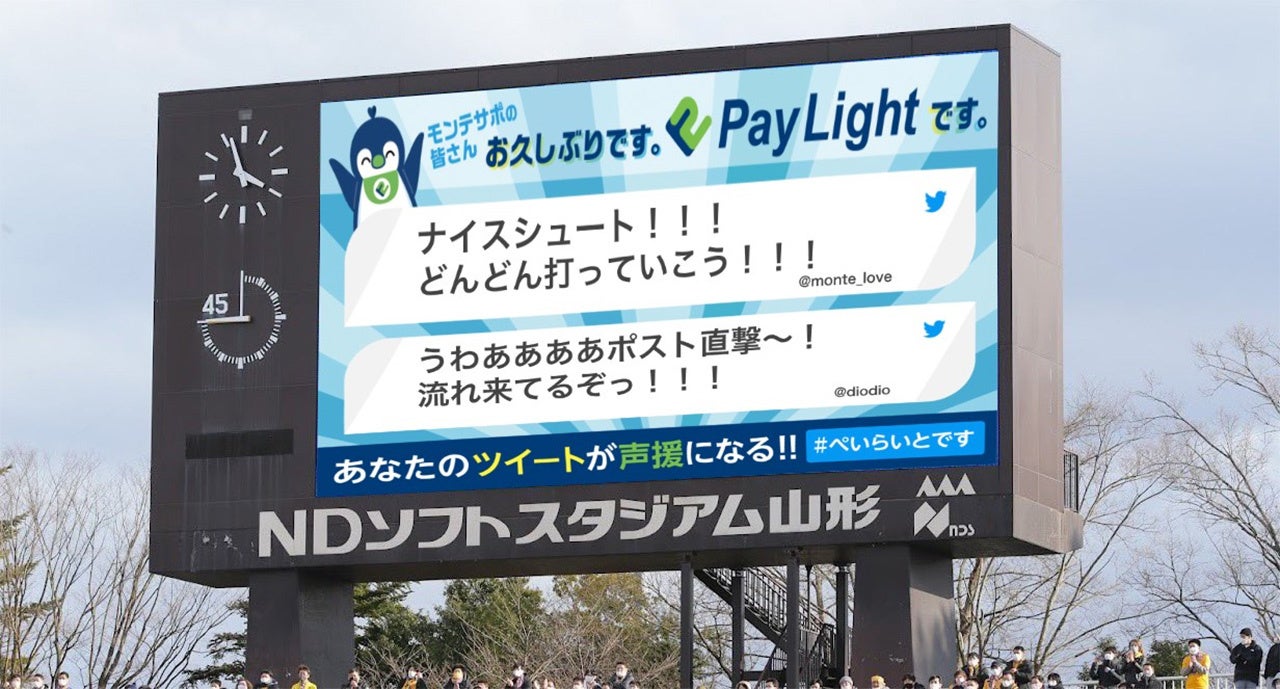 Twitterでハッシュタグ『#paylightです』をつけて、モンテディオ山形の選手たちに応援メッセージを投稿してください!投稿いただいたメッセージをスタジアムの大型ビジョンに投影します!