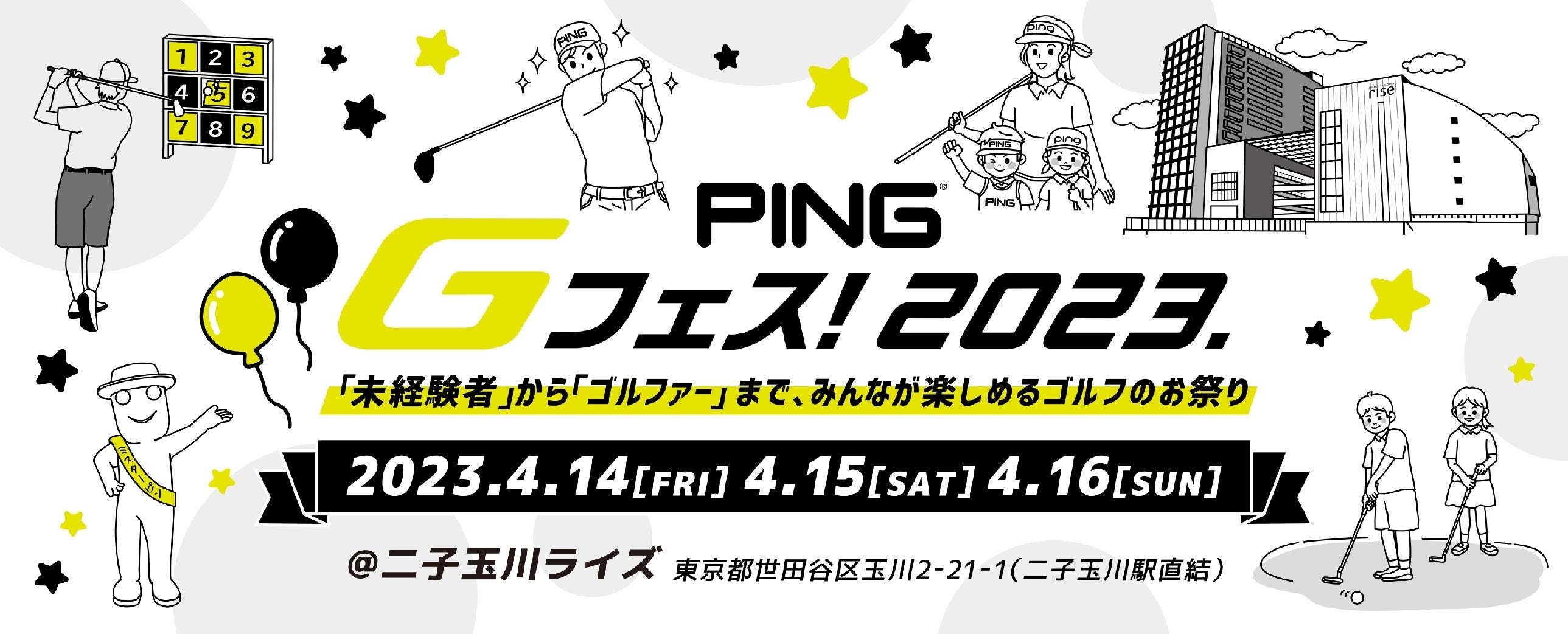 「PING Gフェス!」は、「Gシリーズ」の発売を記念して開催され、ゴルフ経験者から未経験者まで気軽に楽しんでいただけるイベントで、2017年は約14,000人の方にご来場いただきました。6年ぶりとなる「PING Gフェス!2023.」は、「G430シリーズ」の発売を記念し、二子玉川ライズにて開催します。熟練ゴルファー、年に数回楽しむエンジョイゴルファーなどの経験者はもちろん、最近ゴルフを始めたばかりの人、これからゴルフを始めてみたい人、大人から子どもまでご家族で楽しめる祭典です。