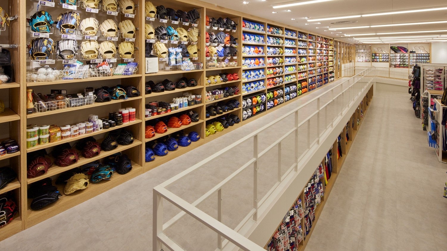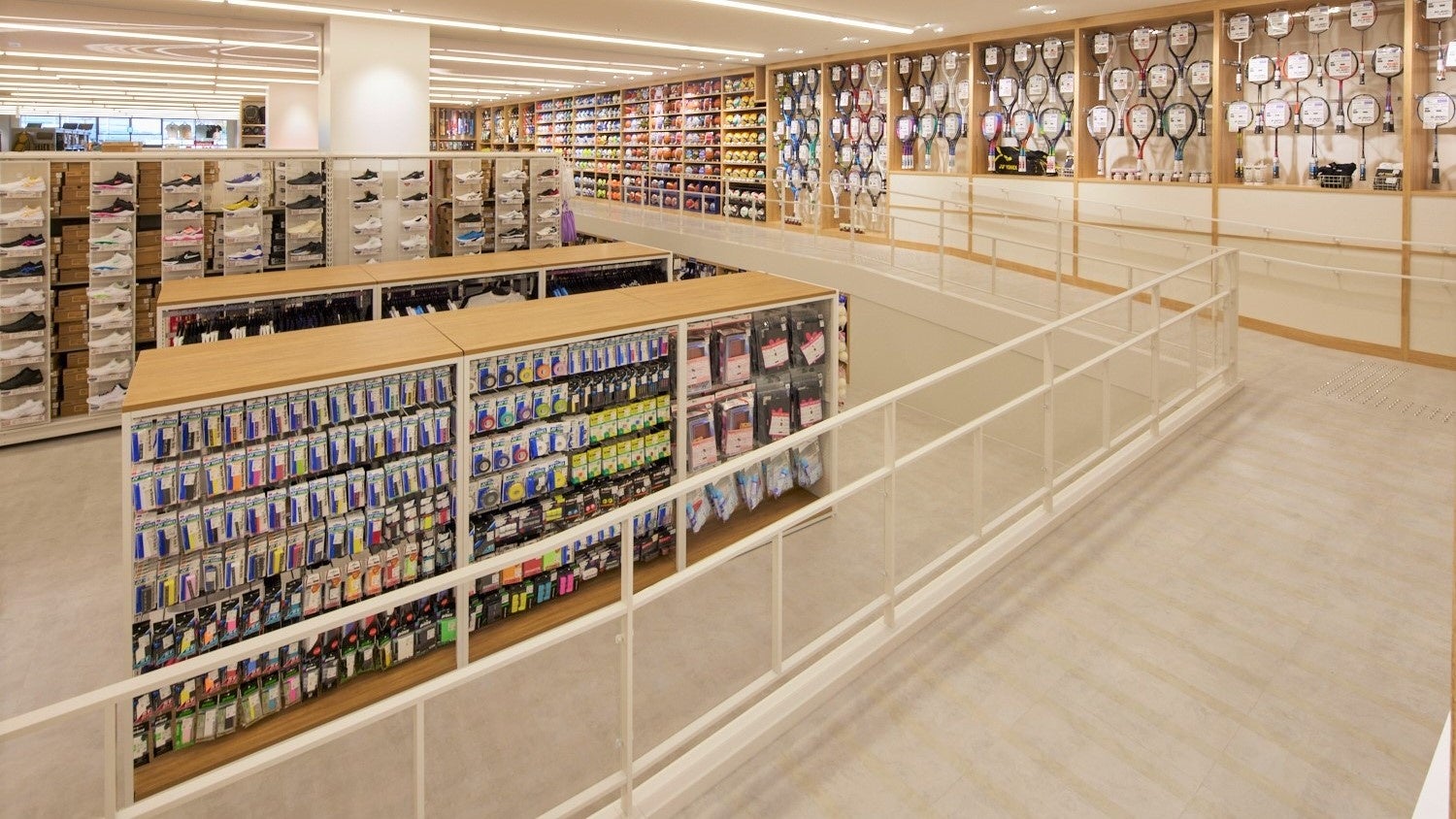 モールの反対方向から歩いてこられたお客さまが、お店に近づくにつれて壁面に浮かび上がるサッカーボールなどのスポーツギア。一段高い「櫓」にギアを展示することで、広いお店のどこに何が売っているかという視認性を高めるとともに、インパクトある「櫓」に遊び心をもって上る楽しみ。お子さまから大人まで、楽しんでいただく仕掛けです。