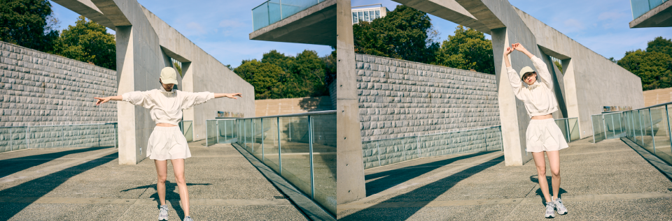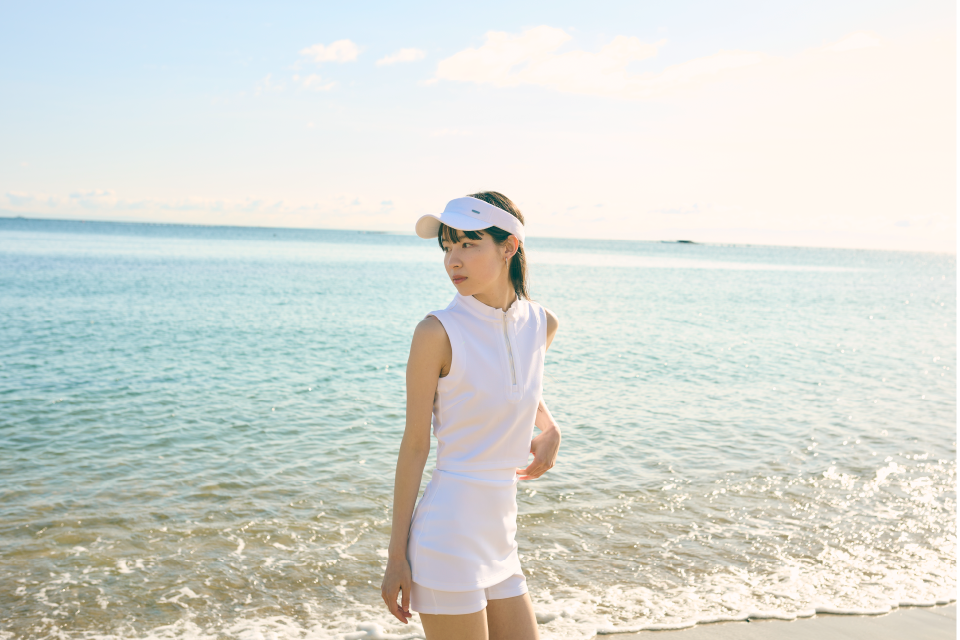 ミニマルなデザインに、メリハリのあるシルエット。機能性も考慮したスポーティな素材でありながら、モダンでフェミニンなカッティングにより、あえてゴルフらしさを削ぎ落としました。ゴルフ場で自然に溶け込むように、空、芝、土などから色選びの着想を得ています。華奢な方にもジャストフィットでご着用いただけるよう、コンパクトなサイズ感を意識しています。