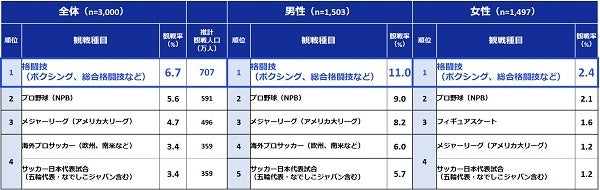 ・インターネット観戦率:21.4% → 前回調査より7.5ポイント増。格闘技が6.7%で1位。