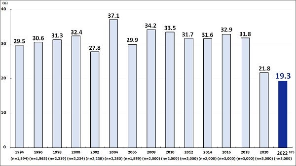 1992年の16. 1%から漸次増加を続け、2000年には40%台に達した。2008年以降は40%台後半で推移する。今回の2022年調査では49. 1%となり、前回調査を0. 8ポイント下回った。