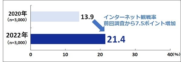 インターネットによるスポーツ観戦率の年次推移を示した。2022年のインターネットスポーツ観戦率は全体の21. 4%で、前回2020年の13. 9%から7. 5ポイント増加した。今回の結果から、過去1年間のわが国におけるインターネットスポーツ観戦人口は、2, 257万人と推計された。