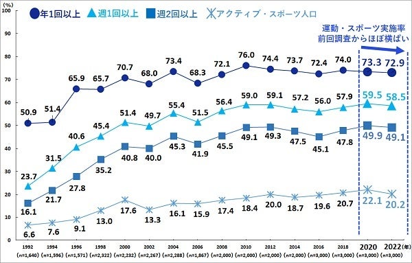 1992年には50. 9%と半数をわずかに超える程度であったが、2000年には70. 7%に上昇した。その後、2006年までは60%台から70%台の範囲を行き来し、2008年以降は70%台での横ばい状態が続いている。今回の2022年調査では72. 9%となり、前回調査から0. 4ポイント減少したが、年1回以上の運動・スポーツ実施率の大きな変化はみられない。