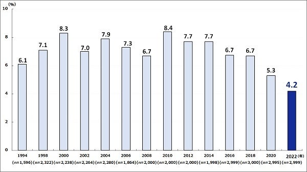 1992年の23. 7%から漸増を続けていたが、2012年の59. 1%から2016年まではわずかに減少傾向へと転じ、定常状態となっていた。2018年に再び上昇し、2020年には過去最高の59. 5%となったが、今回の2022年調査では58. 5%となり、前回調査を1. 0ポイント下回った。