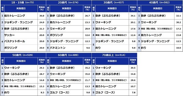 18・19歳は「筋力トレーニング」、20歳代から40歳代、60歳代は「散歩(ぶらぶら歩き)」、50歳代と70歳以上では「ウォーキング」が1位であった。これらの種目以外に、「ジョギング・ランニング」「体操(軽い体操、ラジオ体操など)」もすべての年代において上位15種目に入る。「ジョギング・ランニング」は、40歳代以下では上位5位以内に入るが、50歳代以降では順位が低くなる。
