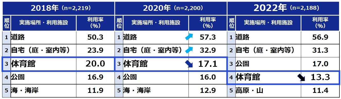 ・実施場所・利用施設「体育館」:13.3% → 2018年調査 20.0%、2020年調査17.1%と減少傾向