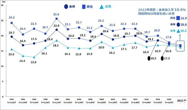 性別にみると、1992年は男性24. 2%、女性15. 6%と8. 6ポイントの差があったが、今回の2022年調査では男性16. 9%、女性16. 2%となり、加入率の男女差はほとんどない。