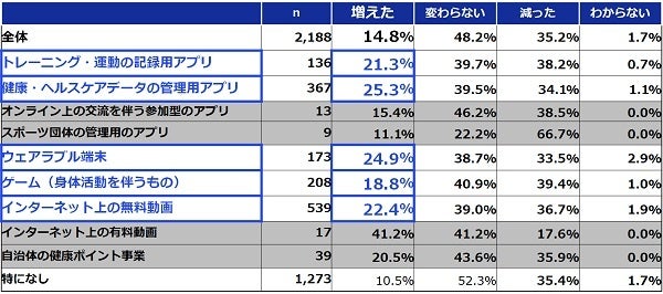 運動・スポーツ実施者全体で、コロナ禍前と比べ「増えた」が14.8%であるが、アプリやインターネットを使用している人では、「増えた」が、「健康・ヘルスケアデータの管理用アプリ」使用者25.3%、「ウェアラブル端末」24.9%、「インターネット上の無料動画」22.4%、「トレーニング・運動の記録用アプリ」使用者では21.3%となっている。ITやテクノロジーを活用している人は、活用していない人と比較して「増えた」が10ポイント程度高い。「減った」と回答した割合に、大きな差はなかった。