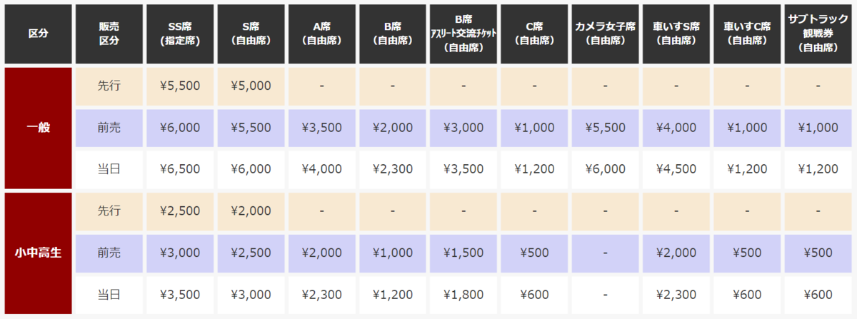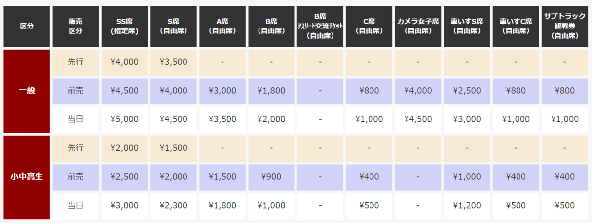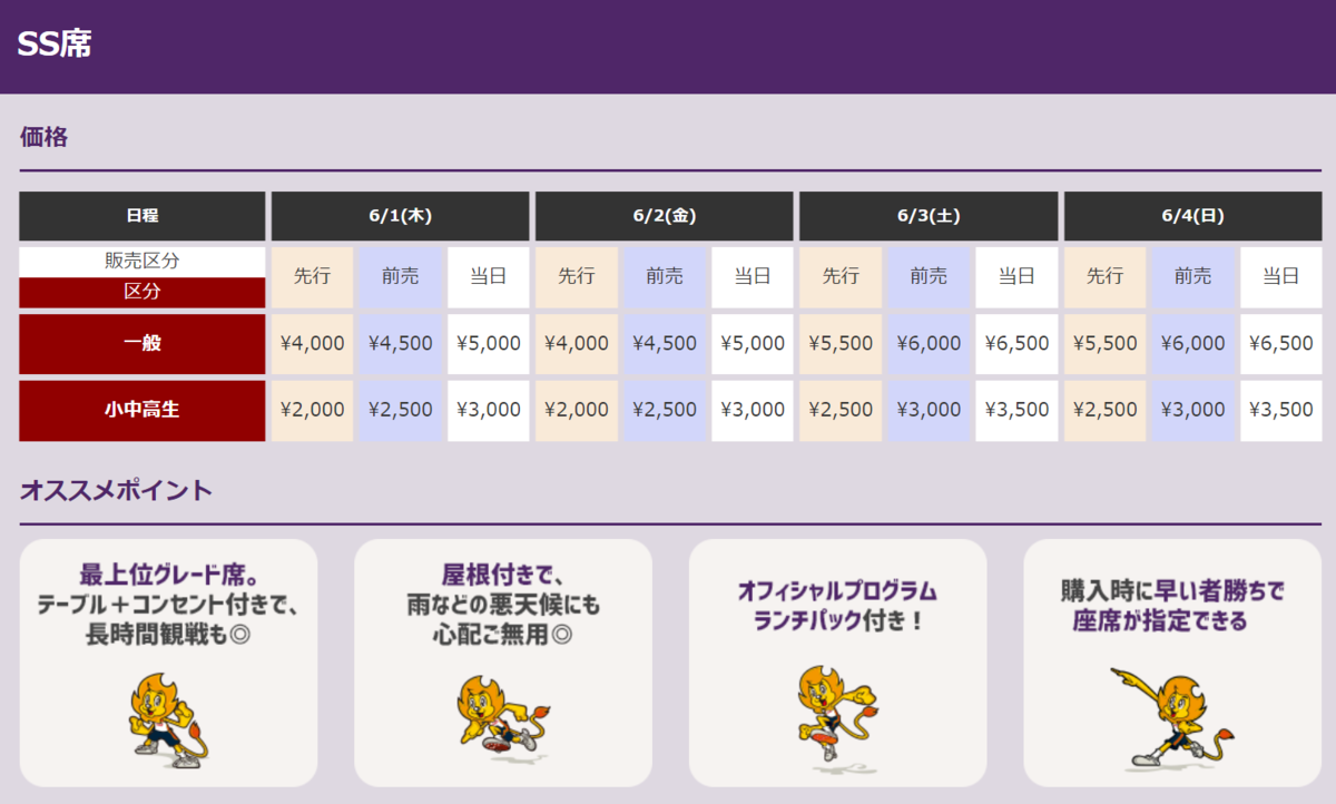 SS席は最上位グレード席。テーブル・コンセント付きの席なので長時間の観戦に最適!購入者にはオフィシャルプログラムと特別協賛の山崎製パンさまよりランチパックもプレゼント。購入時に早い者勝ちで座席指定ができますので、是非お早めにお買い求めください!