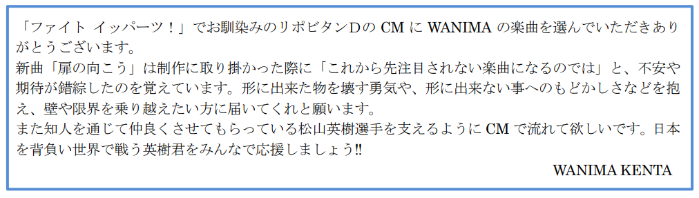 今回の新CMでは日本を代表するロックバンド “WANIMA(わにま)”さんに楽曲を提供いただきます。新曲「扉の向こう」をCMソングとしてタイアップし、リポビタンDのファイトみなぎる世界観と松山選手が持つ力強さ、挑戦することの素晴らしさを最大限にお伝えしてまいります。どんな困難も諦めずに挑戦を続けていく松山選手の姿と、力強いWANIMAさんの新曲をぜひお楽しみください。