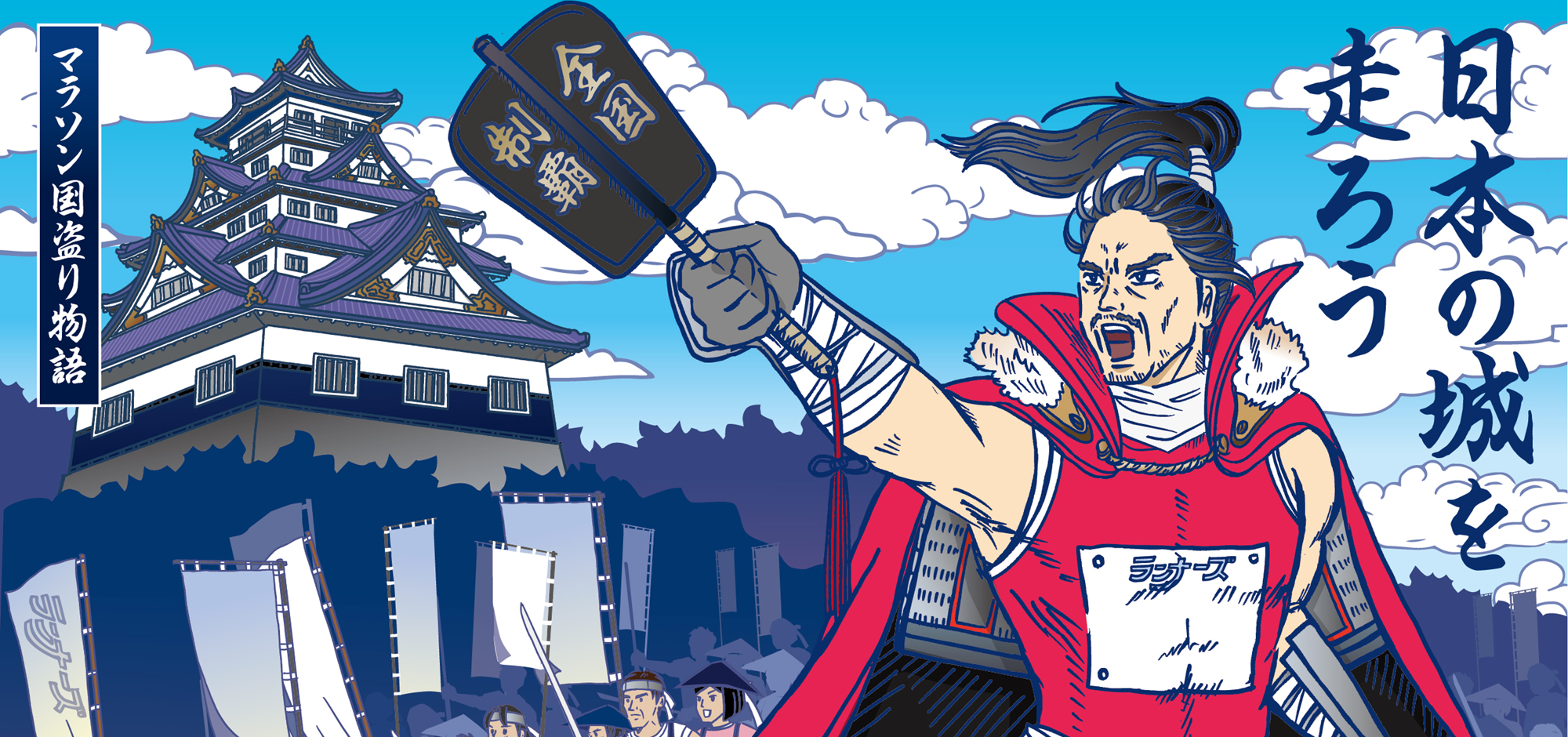 各地に散在する城ゆかりのランニングイベントを「お城マラソン」に認定。完走=走城したランナーにオリジナル「完走タイム入り御城印」を授与。1シーズン3大会走城すれば侍ランナーに。さらにひとりひとりの「走城日本地図」が塗りつぶされ、生涯の走城数によって「足軽」から「天下人」まで立身出世していく“マラソン国盗り物語”です。