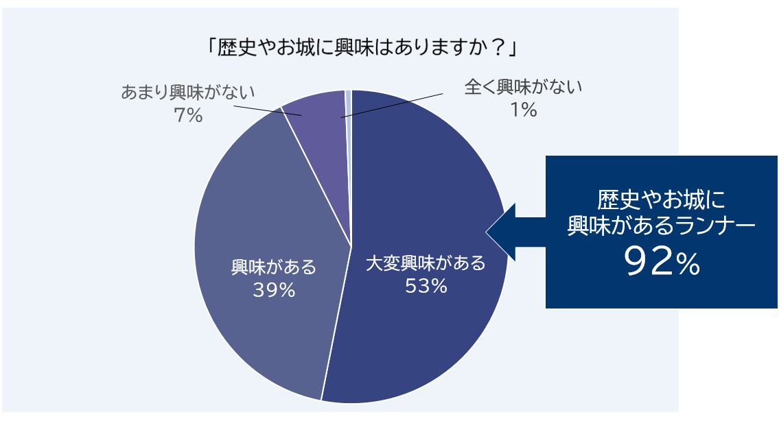 370万人が登録する日本最大級のランニングポータルサイト「RUNNET(ランネット)」を運営するアールビーズ(本社:東京都渋谷区、代表取締役:黒崎悠)が、2月にランナーに行ったアンケートでは、回答者の92%が「大会開催地の歴史文化に興味がある」と答え、回答者のほとんどが、歴史文化施設の中で城郭・城址に興味があると回答しました。