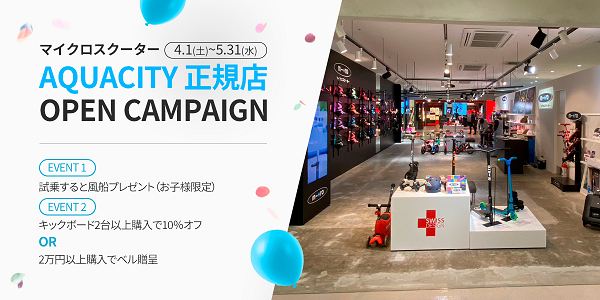 マイクロスクータージャパン株式会社(東京都港区)はアクアシティお台場3階に日本最大級のマイクロスクーター体験型店舗をリニューアルオープンしました。4月1日から5月31日まで子ども用から大人用までキックボードの試乗はもちろんプレゼントキャンペーンも実施致します。