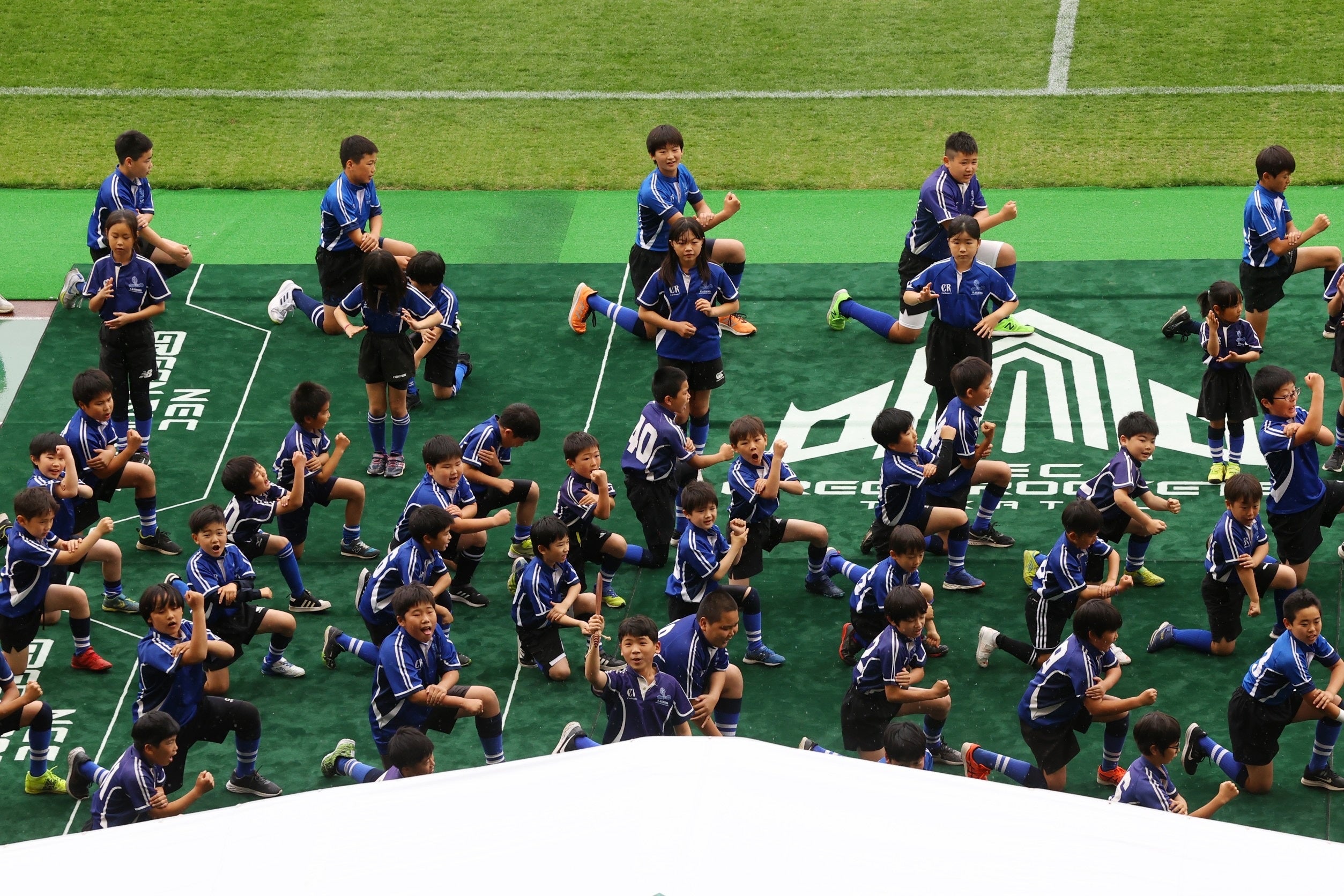 柏ラグビースクール総勢80名による迫力のハカをご覧ください。