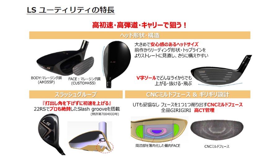 「LS フェアウェイウッド」「LS ユーティリティ」は、いずれも低重心、ハイロフトに設計したことで、「高く飛ばせる、高く狙える」ハイ・ローンチ設計のクラブに仕上げました。また、フェアウェイウッドは42.5インチ(メンズ)、ユーティリティは39.5インチ(メンズ)でクラブ長さを短めに統一し、ターゲットユーザーが番手別の飛距離差をやさしく、正確に出しやすい設計となっています。さらに、「Slash Groove(スラッシュ・グルーブ)」や「CNCミルドフェース」を搭載し”ギリギリ”の高初速を実現しています。このほか、安心感のある大きめのヘッドサイズに加え、V字ソール設計で、どんなライからでもやさしく上がる、抜けるクラブとなっています。